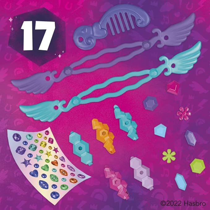 - 17 ACCESSORIES: Brush hair styling doll with included comb, style with barrettes and charms, decorate wings and horn with gem sticker sheet