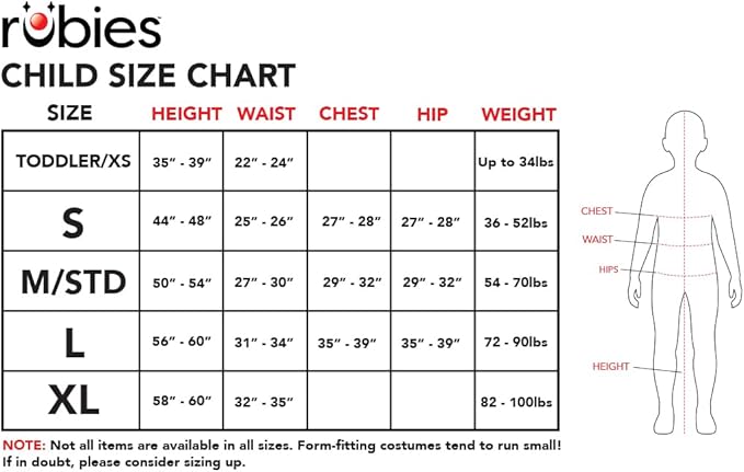 - SIZE MATTERS: Costumes don’t adhere to standard clothing sizes; please consult the Rubies Child size chart in images, reviews, and Q&A for the best fit, avoiding selection based solely on regular apparel size.