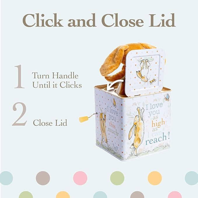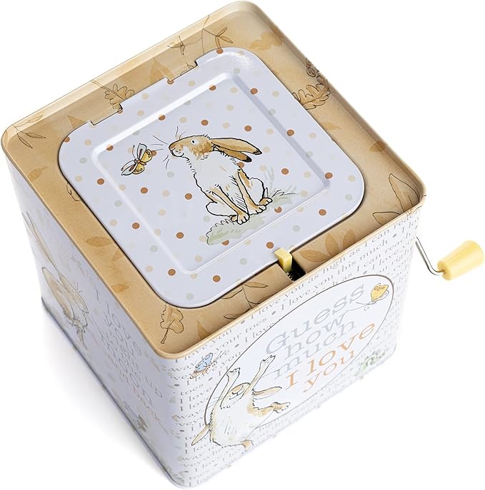 - LASTING FUN: Classic jack in the box musical toy is made of durable, sturdy metal and plush puppet pop up. Adorned with storybook artwork of Nutbrown Hare of the book Guess How Much I Love You.
