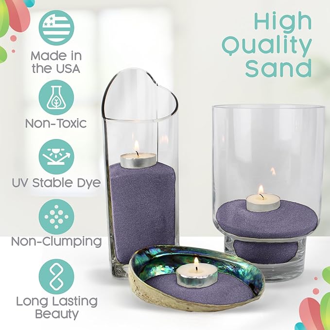 - Non-Toxic Craftsmanship, Made in the USA: Crafted in Burleson, Texas using organic ingredients, this non-toxic sand guarantees safety for all. UV-stable and resistant to fading in light, Sandsational Sparkle wedding sand ensures a lasting and vibrant presence in your wedding decorations, maintaining its allure over time. Sandsational Victorian Lilac decorative sand is colorful and made to last.
