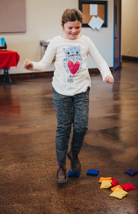 - Throwing, catching, movement games, color recognition, and my kids favorite “bean bag war.”