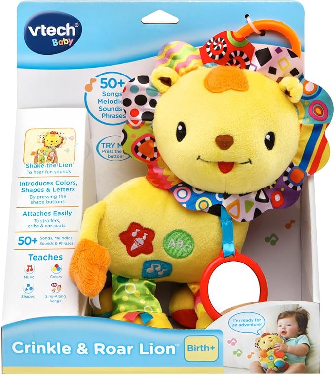 - Press the colorful shape buttons on the Crinkle and Roar Lion to explore shapes, colors and letters
