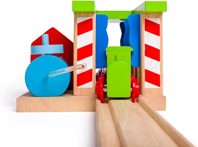 - EDUCATIONAL TOYS - This wooden train set accessory encourages dexterity, hand-eye coordination and fine motor skills as children run their toy trains through the washer to get it clean.