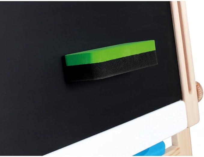 - DOUBLE-SIDED MAGNETIC WHITE AND BLACKBOARD EASEL – Our durable wooden easel has all of the art supplies needed for your child to express their creativity. This art easel includes: magnets, craft paper, storage tray, 3 chalks, 1 marker and an eraser.