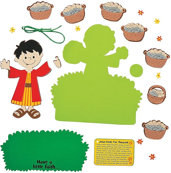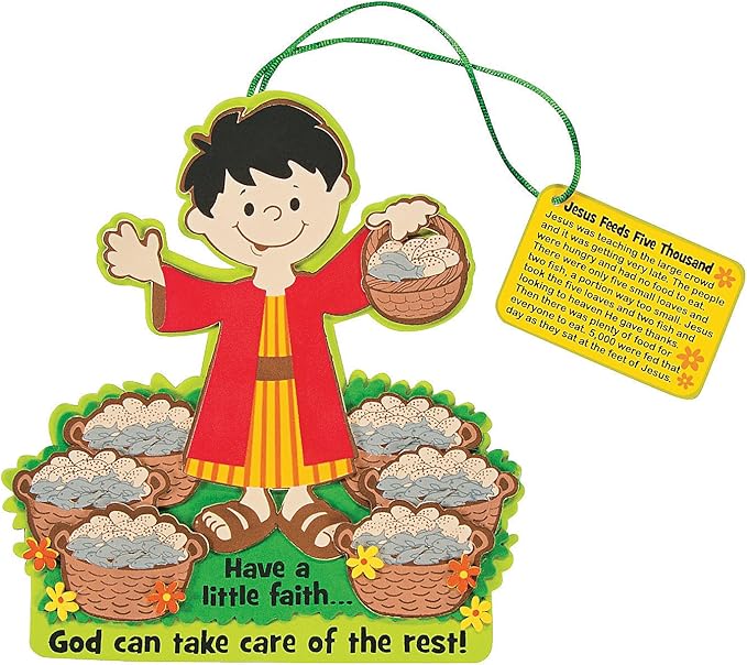 - Learn how Jesus feeds 5000! Includes self-adhesive foam pieces and a satin cord for hanging. Makes 12. 61/2 x 7 1/4"