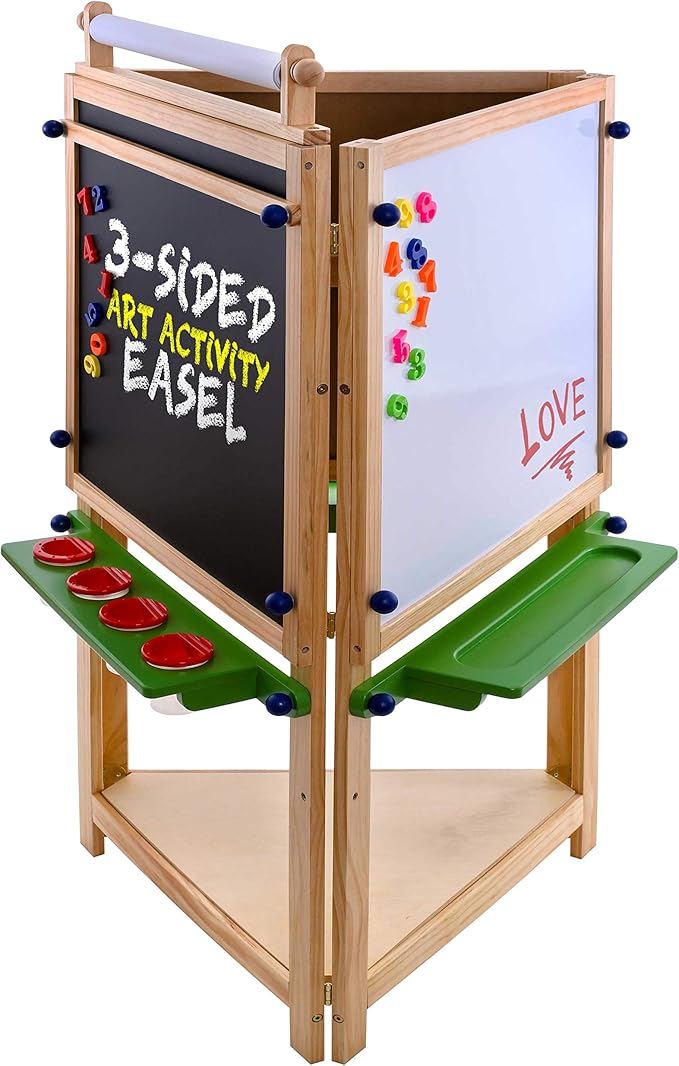 - Fun-filled versatile quality wooden children's 3-sided art activity easel that's designed with a sturdy pine wood triangular frame. It's three different fun activity stations make it the ideal learning tool for the young aspiring artist to develop their fine motor skills. Preschool teachers love them because the easel can be used by 3 children at the same time, with one at each different play station.