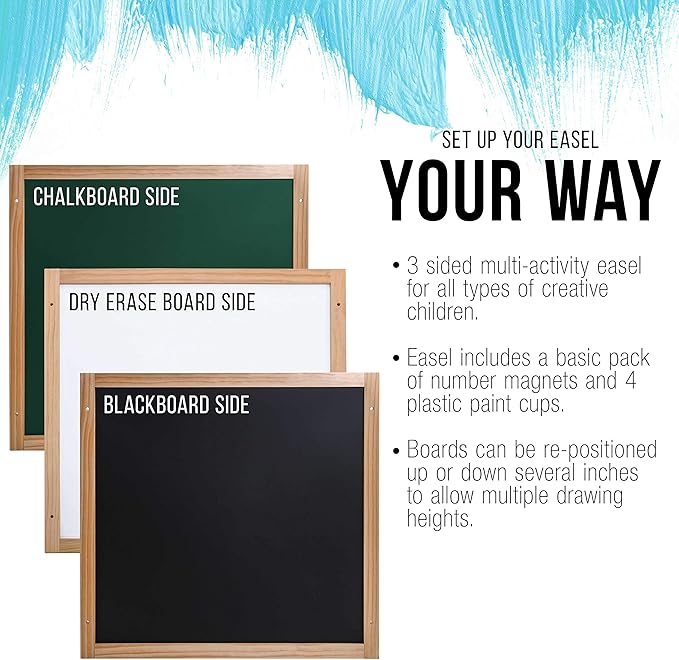 - Each of the 3 sides of the easel has a different child's activity area that includes a magnetic green chalkboard, magnetic dry erase white board and a magnetic blackboard with a full roll of 18" paper and a holder/feeder. It's the perfect creativity easel for learning how to paint, draw, write, sketch and more! Includes an educational set of 26 colorful magnetic numbers and math symbols for kids to learn numbers or do math equations while they play.