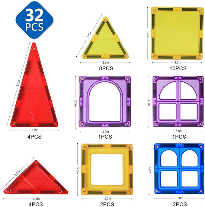 - 【Classic Beginner Set】The magnetic tiles beginner set 32 pieces for preschool learning include 10*Small Square,8*Equilateral Triangle,4*Right Triangle,4*Long Triangle,3*Window,2*Window Frame,1*Door,1* Beautiful gift box,1* Color page with many reference models,1*Warranty card.