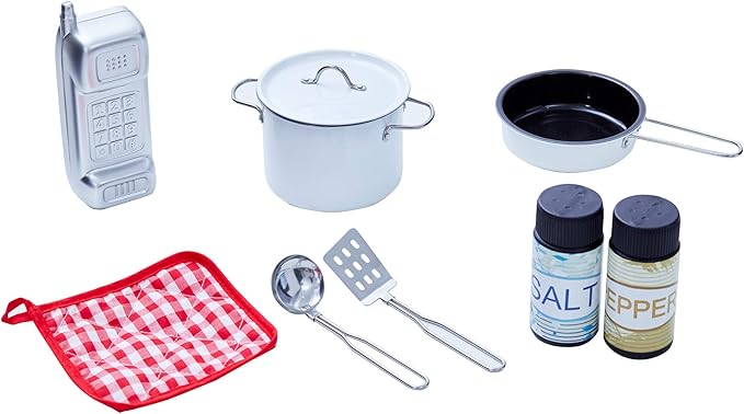- 9-PIECE ACCESSORY SET: Vintage-looking metal cookware with a white finish a toy phone handset that attaches to the side of the playset with not in use, and a red and white pot holder