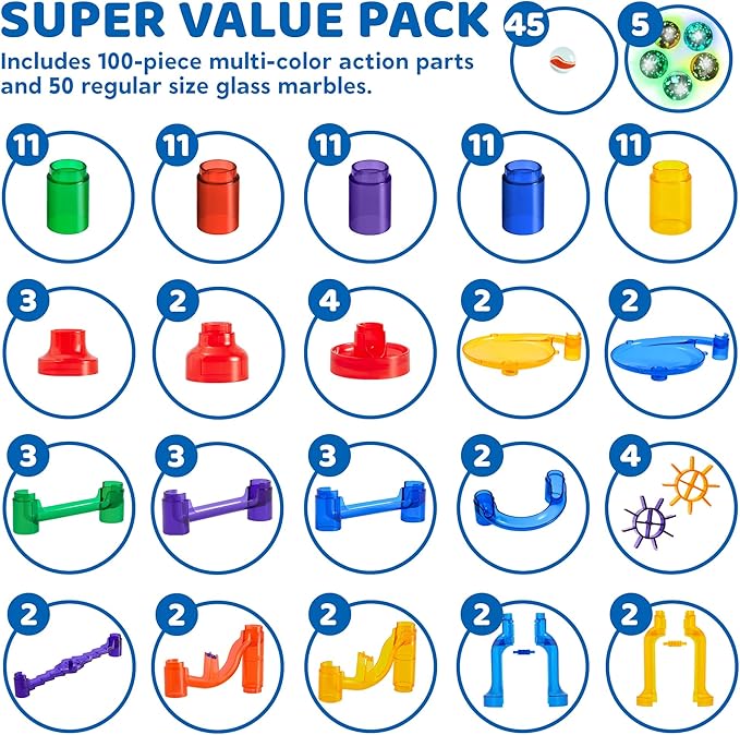 - This STEM marble run set comes with an assembly instruction to help kids’ hand-eye coordination. After they learned, they will have ability to build any different tracks by their imagination and logical mind. Perfect Toy Set to develop kids’ creativity, logical thinking, hand-eye coordination. Play and Gain patient and problem-solving ability. Excellent Gifts for all kids