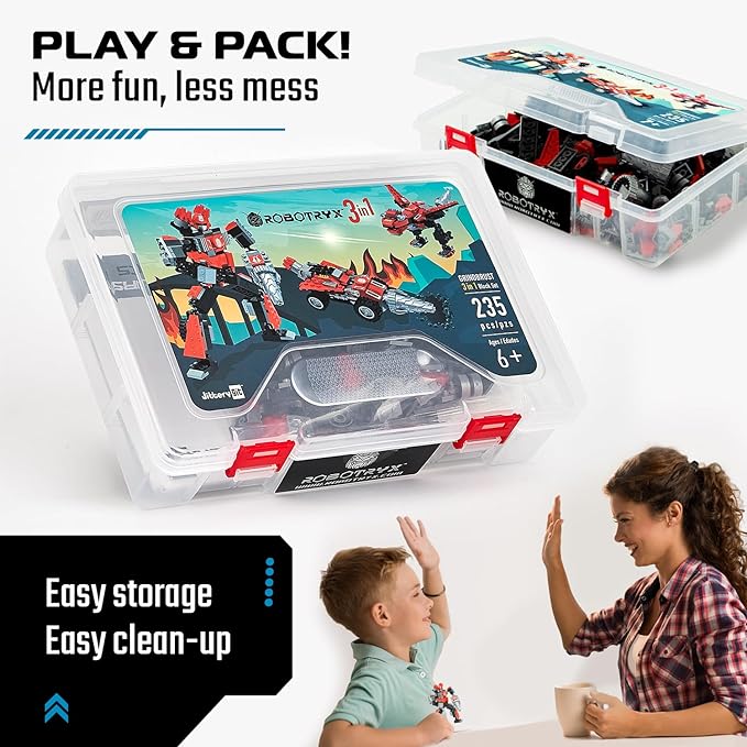 - 【The only building bricks set with a storage box】Each of our designed in USA Robotryx kits comes in a colorful storage box in which all the pieces can be stored after play. This means no more mess to give parents a easy break. It also means on-the-go fun with ready portability that can be taken wherever kids go so they can stage outer space battle scenes.