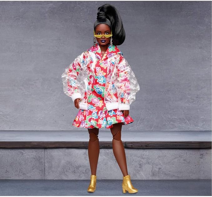 Barbie BMR1959 Fully Poseable Curvy Fashion Doll, Brunette, in Clear Vinyl Bomber Jacket and Floral Hoodie Dress, with Accessories and Doll Stand