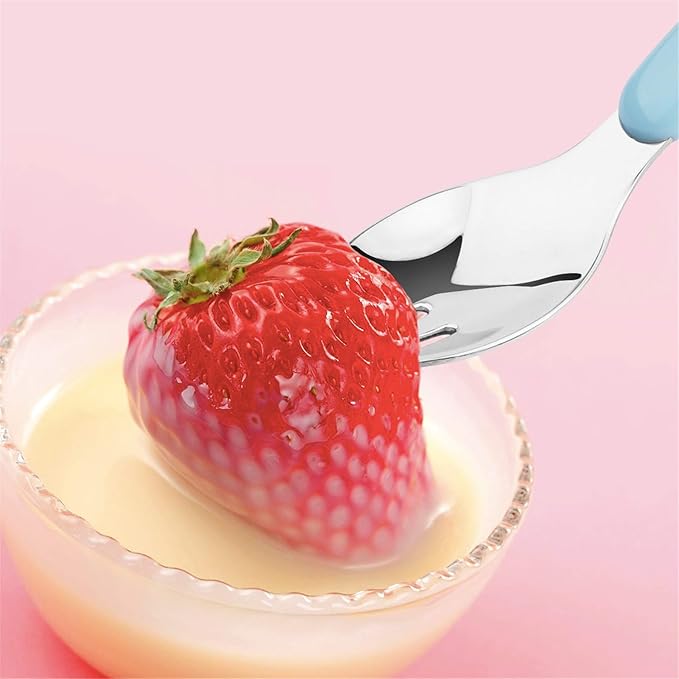 - Easy to Self-feed: This toddler silverware set is curved handles which are easy for child to grab, help your baby learn to eat. Never need to worry about sharp edges will damage babies. Deeper spoon bowl make scooping foods and liquids more easier. Great for your babies learning self-feed.