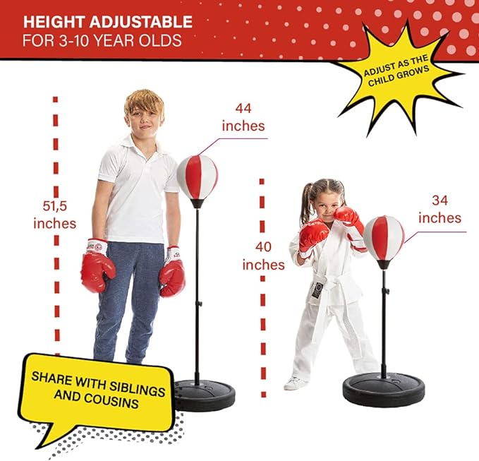 - EASY TO USE: This standing punching bag comes with a FREE pump and 6 ounce boxing gloves for kids. Perfect kids boxing training equipment! The Bullseye Boxing Kit comes with full instructions so it’s easy to set up. It has an adjustable height from 34” to 44” and the round base is solid with a carry handle for transporting around. Made from Non-Toxic, robust PU Leather.