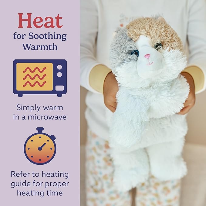 - Heat Up for Soothing Warmth: Help ease cramps, aches, or tension with soothing warmth by placing plush on the affected area. Simply warm it up in a microwave for up to 90 seconds. Refer to the included heating guide for proper heating time.