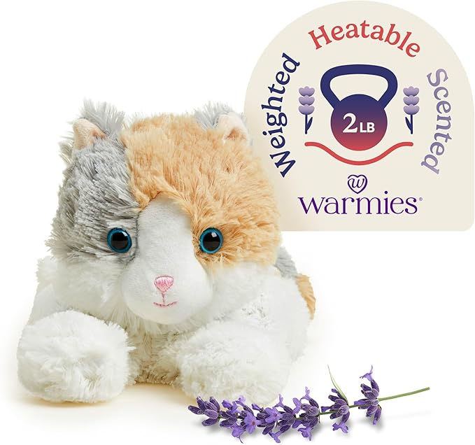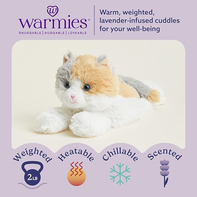 - Warmies Microwavable Stuffed Animal: Calico Cat is a snuggable, huggable, lovable weighted plush toy for all ages that can be easily heated to provide hours of soothing warmth and calming comfort, or chilled to provide cooling relief. 13 inches. 2 lbs.
