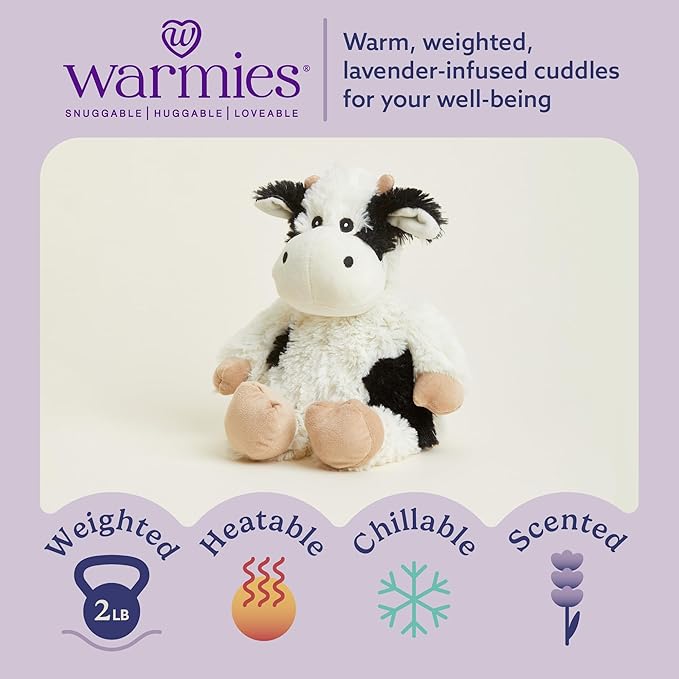 - Warmies Microwavable Stuffed Animal: Black and White Cow is a snuggable, huggable, lovable weighted plush toy for all ages that can be easily heated for hours of soothing warmth and calming comfort, or chilled to provide cooling relief. 13 inches. 2 lbs.