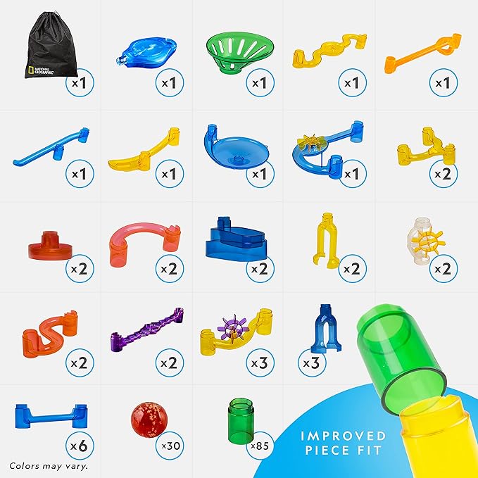 - STURDY, TIGHT-FIT PIECES - This construction kit is designed to fit together snuggly, so your marble maze won’t fall apart while you play. With 9 sturdy bases, 26 exciting action pieces, and 85 clear smooth-run tube pieces, our kit has countless imaginative configurations