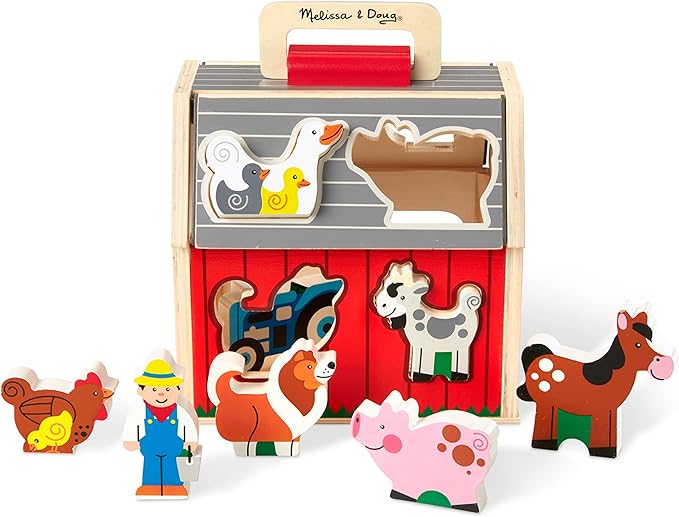 Melissa & Doug Wooden Take-Along Barn Toy with Flip-Up Roof and Handle, 10 Farm Play Pieces, Shape Sorting And Stacking Learning Toys For Toddlers And Kids Ages 2+