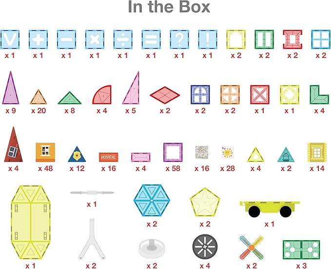 - FEATURING 1) School, Hospital, and Police Station 3-in-1 Theme Magnetic Backing and Maps 2) Ferris Wheel Combo 3) Castle Clip-On 4) Rocket Set 5) Windmill 6) 56 Educational Graphics for Alphabet Animals, Numbers, Fruits, and Objects Learning 7) Math and Symbols 8) Windows 9) Geometry Shapes 10) Detachable Wheels 11) Car 12) Handcraft Art to allow unique designs from this all-in-one stand-alone magnet construction toy building block kit to offer open-ended possibilities and most creative fun