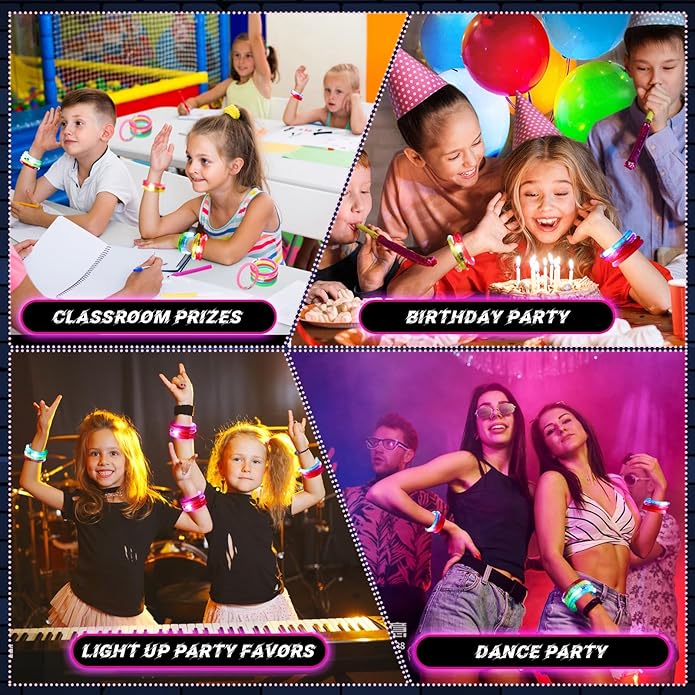 - 【Light up Toys Party Favors】 Perfect gifts for kids party supplies, good for classroom prizes to fill student prize box and as gift for kids goodie bag stuffers. Geting these glow in the dark light up toys. The light up bracelet is suitable for party lovers, dancers, cosplayers, children, men, and women, you can put it anywhere, such as your wrists, arms, and ankles, depending on yourself.