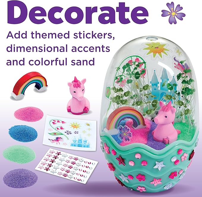 - UNICORN GIFTS FOR GIRLS: Decorate, plant, and grow your own magical terrarium in a unicorn egg-shaped mini garden. The craft kit for kids contains quick-growing chia seeds and fun decorations that will bring your unicorn craft to life (Unicorn Garden measures 5.25” h x 3” w.)