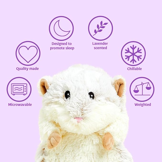 - Warmies Microwavable Stuffed Animal: Hamster is a snuggable, huggable, lovable weighted plush toy for all ages that can be easily heated for hours of soothing warmth and calming comfort or chilled to provide cooling relief. 13 inches tall. 2lbs.