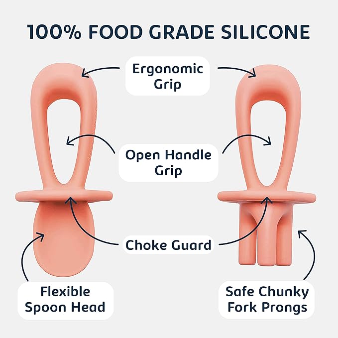- TRAINING UTENSILS FOR BABY: Train your little one to be an independent self-feeder with a food grade silicone spoon and fork that feels soft and gentle on their gums. Our Tiny Twinkle silicone training utensils or baby-led weaning tools encourage your babies and toddlers in their first stage of self-feeding to learn how to eat in a fun, easy, and safe way.
