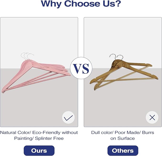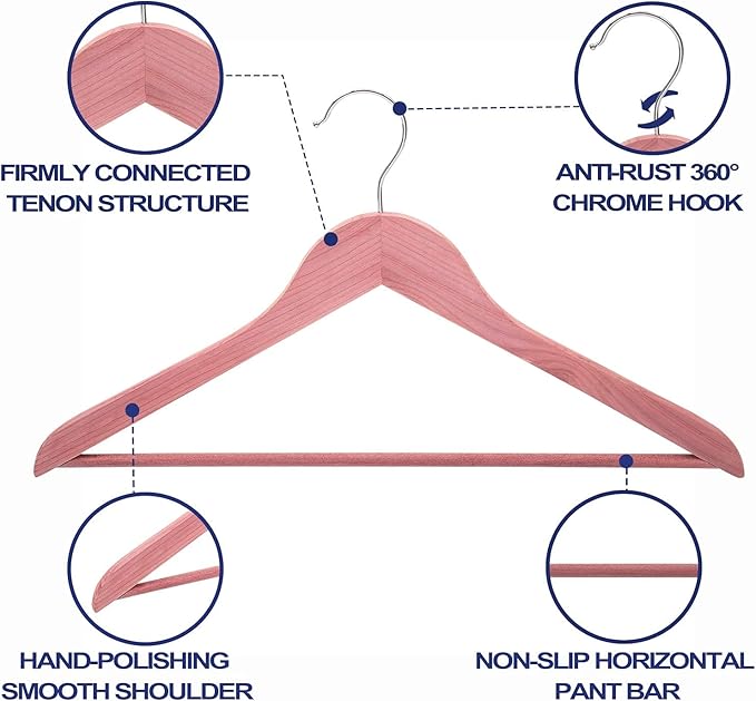 - Space Saving & Multi-purpose: Slim wood coat hangers with 360° rotating chrome hook, convenient for clothes storage and provide maximum storage for closet. Cedar suit hangers with strong pant bar, ideal for shirt, jacket, trouser, dress etc.
