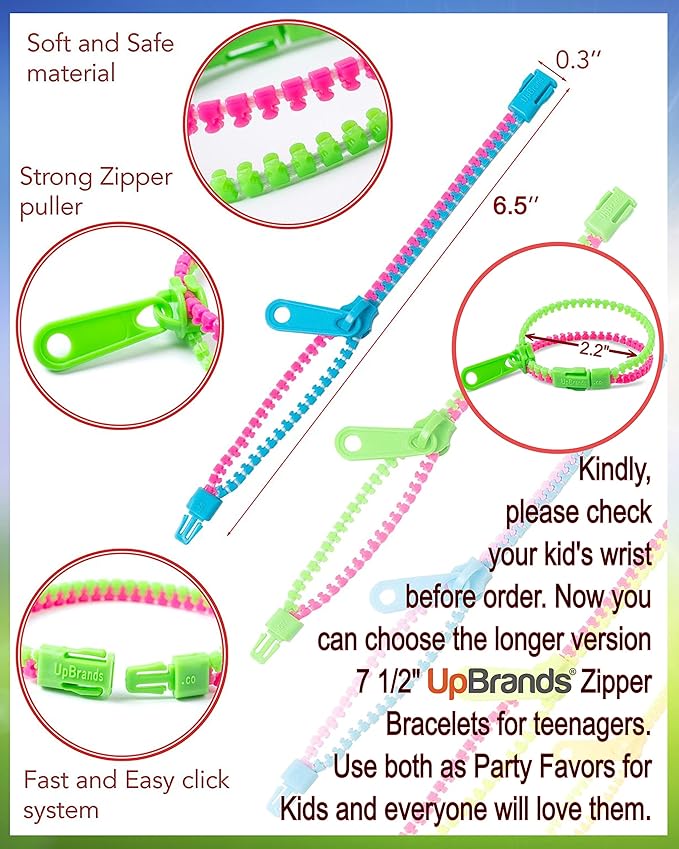 - Every zipper bracelet measures 6.5 inches. Bracelets are packed in a highly resistant zipper bag. UpBrands Fidget Zipper Bracelets 24 pack are in a wide variety of bright and vivid colors.The design of these zippy bracelets helps to keep hands busy and relax by playing with