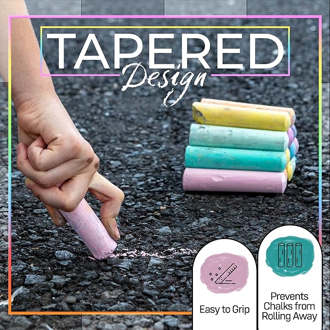- Easy Grip, No Roll Design: Our tapered sidewalk chalk sticks fit little hands perfectly and won't roll away. This outdoor chalk pack lets your creativity shine with vibrant colors on sidewalks and driveways. Ideal for teaching materials and fun outdoor activities like kids chalk sidewalk art