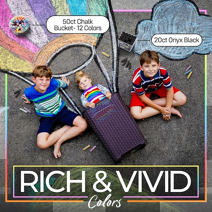 - Handy Storage Solution: This sidewalk chalk for kids comes in a reusable plastic bucket with a handle and lid, making cleanup and organization a cinch. The jumbo chalk bucket keeps your non toxic chalk ready for the next outdoor adventure, perfect for holiday travel and spring art activities