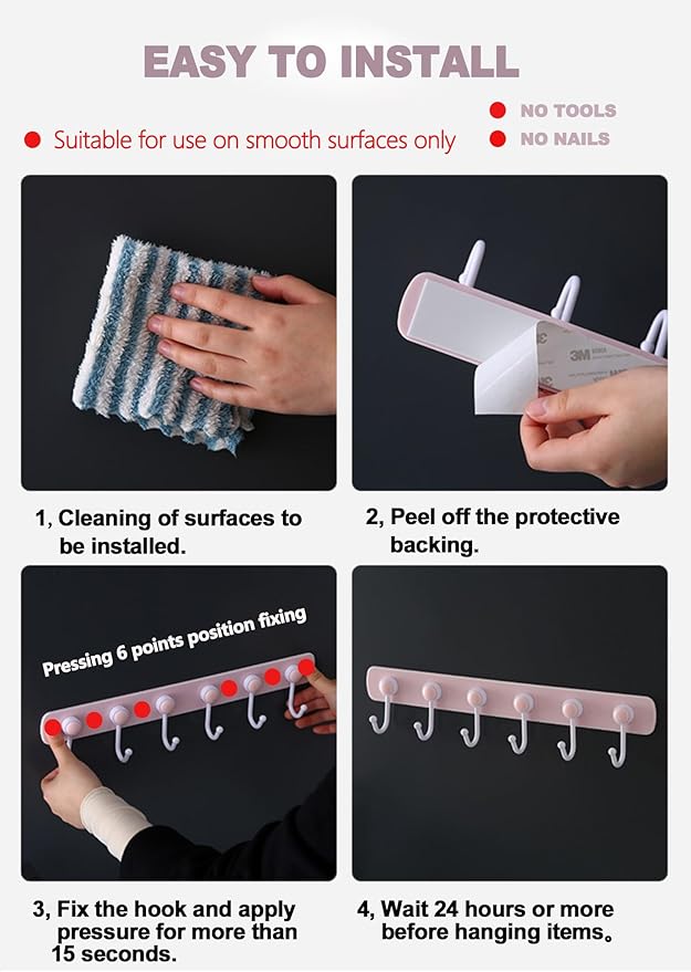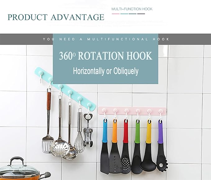 - Innovative Design: Effortless installation and usage with NO TOOLS, NO SCREWS, and NO HOLES required. Features 6 hooks with 360-degree rotation for customizable placement. Ideal for use in the kitchen, bedroom, foyer, hallway, or office, maximizing space-saving potential