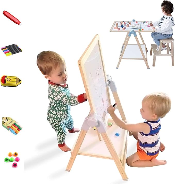 - 1.KIDS WOODEN STANDING ART EASEL TABLE:This toddler easel provides a creative, screen free play option for children and includes 1 whiteboard and chalkboard double-sided drawing board, 1 storage board, 8 dust-free chalks, 1 magnetic chalk case, 10 magnetic beads, 8-color whiteboard pen, 1 white board eraser.