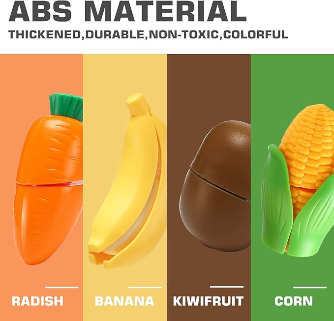 - Realistic Design: Match pieces together easily, which can be cut and played repeatedly. For children, fruits and vegetables are easy to cut.The "slicing" noise accompanying the cutting can bring endless fun to the children