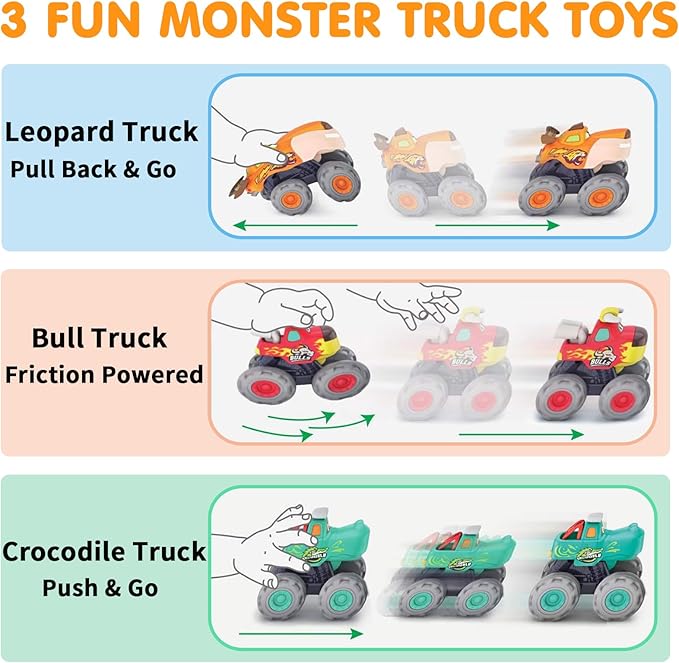 MOONTOY Toy Cars for 1 2 3 Year Old Boys, 3 Pack Friction Powered Cars Pull Back Toy Cars Set - Bull Truck, Leopard Truck, Crocodile Trucks, Push and Go Toy Cars for Toddler Boys Baby Gift.