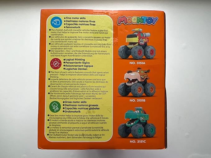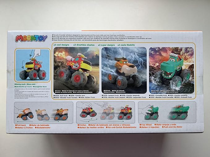 - 【3 Sets Monster Trucks Toy】MOONTOY monster trucks set include 3 unique wild animals toy car figures model: bull, leopard, and crocodile. No battery needed energy-saving and environmentally friendly.