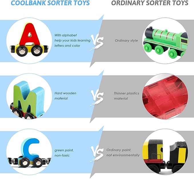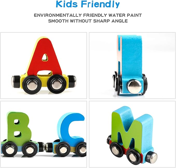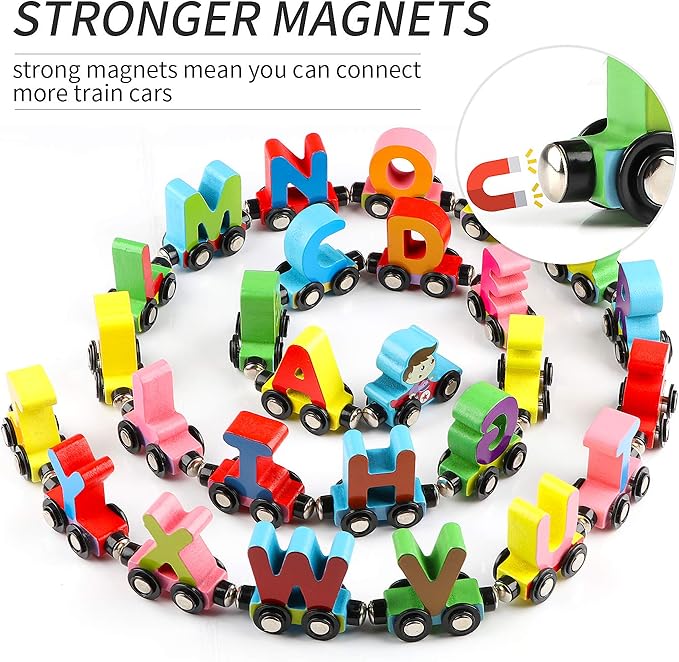 - Stronger Magnet: The magnets on our alphabet trains were carefully chosen and have been tested extensively to be stronger than those in other sets. This means more train cars can be connected together to make longer trains. 27 pcs wooden alphabet train compatible with other track toys