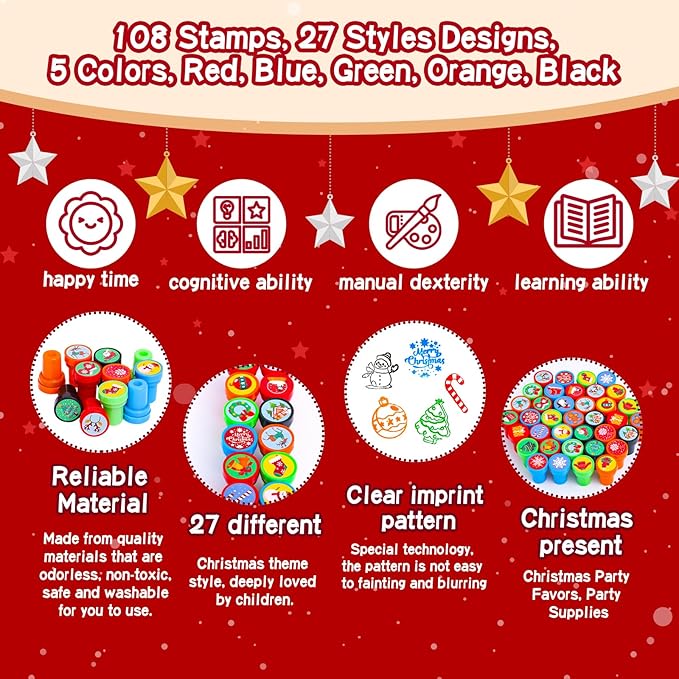 - Package included: 108 Pieces Christmas Assorted Stamps with 27 Designs, 5 Colors Christmas Stamps. Each Size Approx. 1.29’’ height, 0.98’’ length.