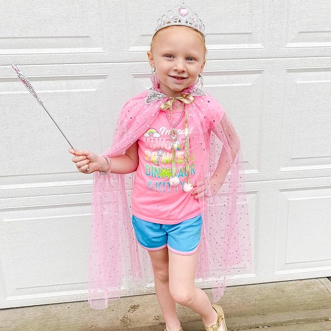 - Princess Dress up Costume Set : Come with glitter princess cloak,princess crown tiara, princess wand, earring, bracelet, ring, necklace. It includes everything your little girl needs in her princess dress up play
