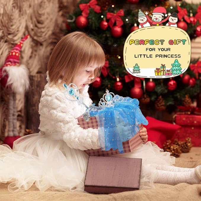 Fedio Princess Cape Set 7 Pieces Girls Princess Cloak with Tiara Crown, Wand for Little Girls Dress up (Blue)