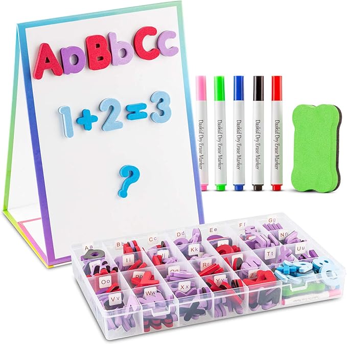 - VALUABLE EDUCATIONAL TOOL: Foam alphabets educational early teaching set is designed for children, helping them create sentence, count numbers, do the math, learn the alphabets. During the fun playing, it's natural and gradual to enhance children’s creativity, imagination and ability. they can draw, write and play games with parents or teachers on the magnetic writing board, whether at home, school.