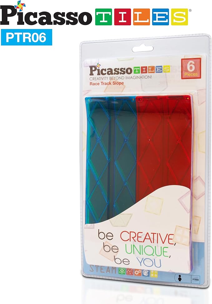 PicassoTiles 6 Piece Race Track Ramp Magnetic Building Block Set Magnet Tiles Construction Toy STEM Learning Kit Education Playset Playboard Pretend Play Stacking Blocks Child Brain Development PTR06