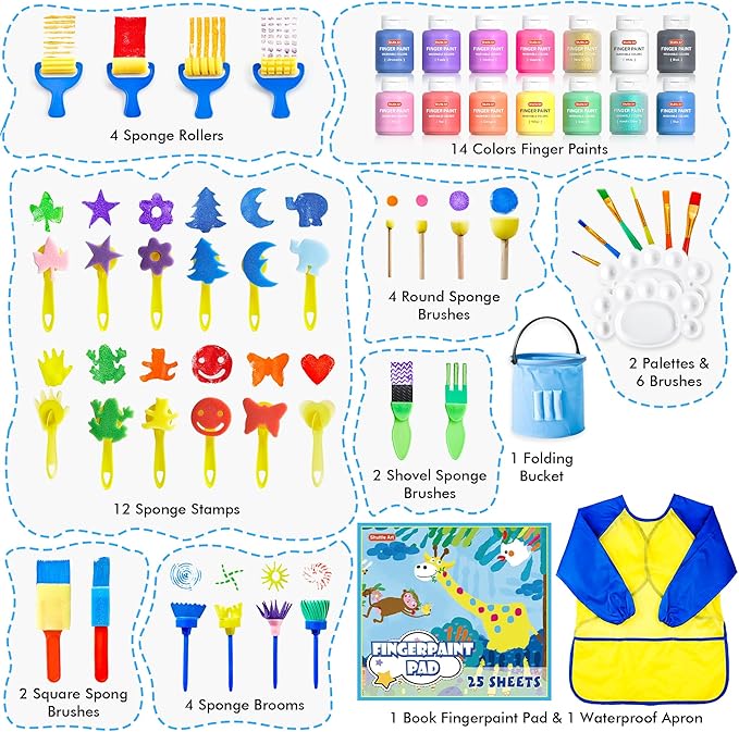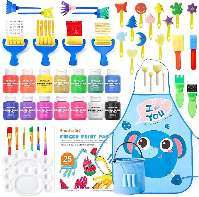 - COMPLETE KIDS PAINT SET: Shuttle Art 46 pack kids finger paint set contains 14 colors washable finger paints in bottles (60 ml/2 oz each), including classic, neon and glitter colors, together with 1 finger paint pad, 1 palette, 6 painting brushes, 12 sponge stampers, 4 roller sponges, 6 sponge shovels and brushes, 1 water-proof smock, a complete kids paint set for toddlers and young children aged 3+