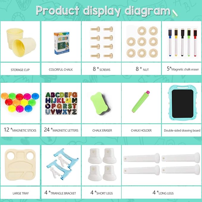 - 🔮Easy To Assemble And Adjust: The detailed installation instructions are located at the bottom of the carton, with plastic screws and nuts, which are beneficial to enhance the child's hands-on ability and intelligence, which is easy and fun for children. You can also adjust to the height you need by replacing the two types of easel feet to meet the different needs of children aged 3 years old. There is no doubt that even if your child grows up, he can always use it.