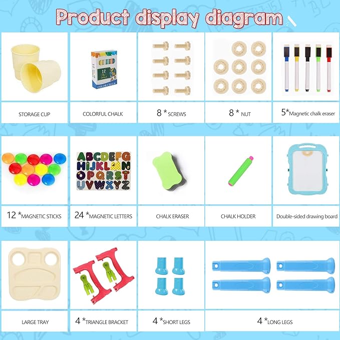- 🔮Easy To Assemble And Adjust: The detailed installation instructions are located at the bottom of the carton, with plastic screws and nuts, which are beneficial to enhance the child's hands-on ability and intelligence, which is easy and fun for children. You can also adjust to the height you need by replacing the two types of easel feet to meet the different needs of children aged 3 years old. There is no doubt that even if your child grows up, he can always use it.