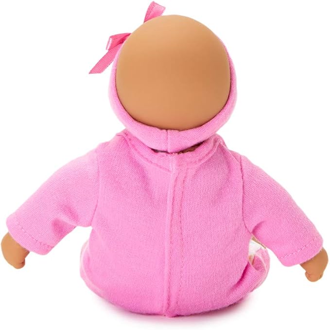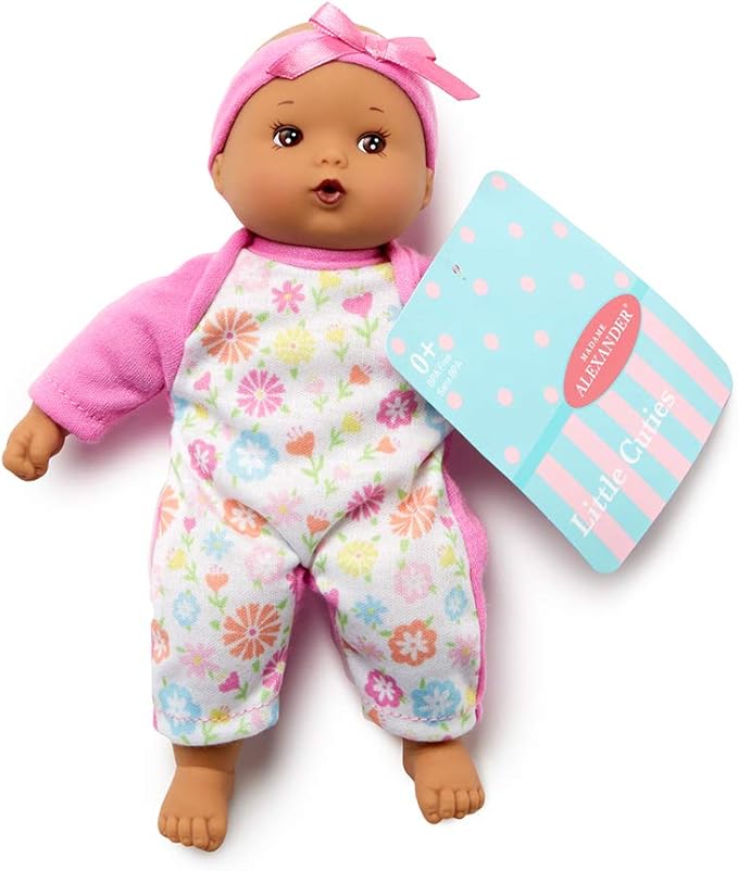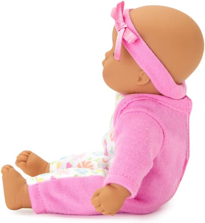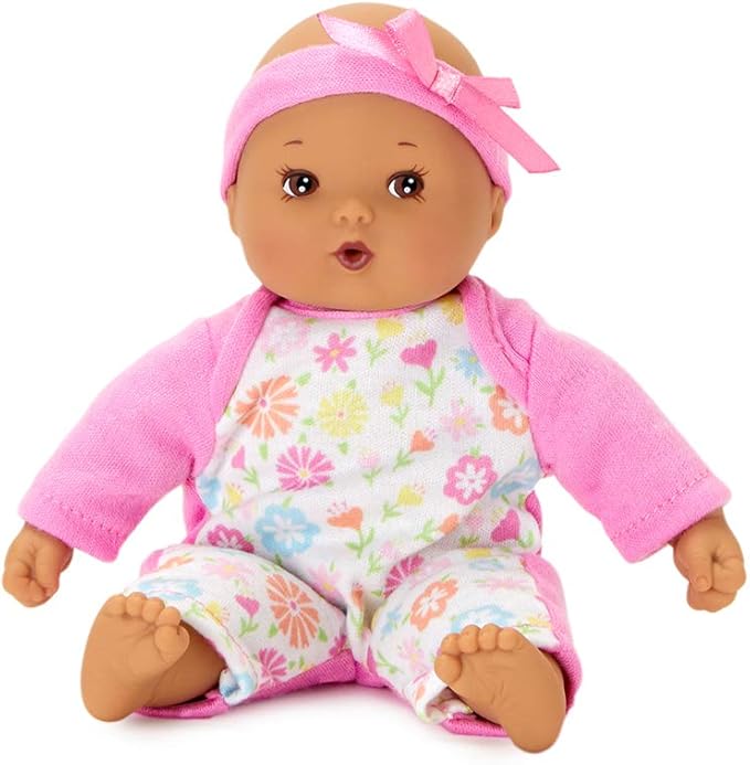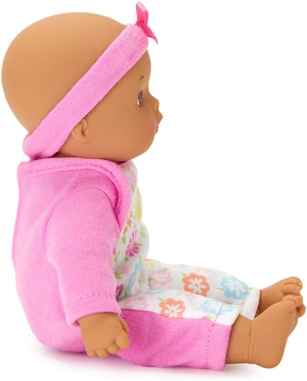 - Details: Dressed in colorful, removable outfits, their beautiful, painted eyes and lively faces are sure to charm your child; Dressed in a floral sleeper and hat; Features medium skin tone and brown eyes