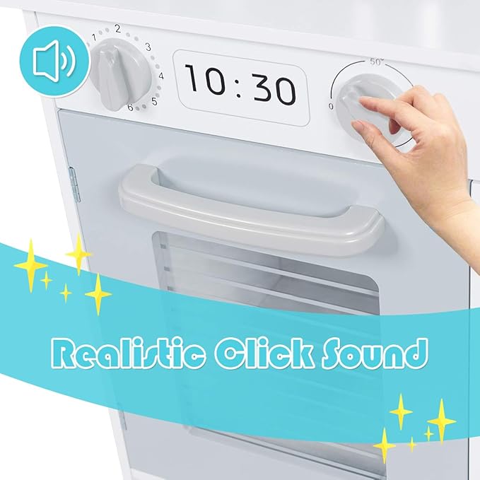 - 【Sturdy & Durable Construction】:Made of durable MDF material, this kid kitchen toy set features sturdy and stable frame for longer serving time. And the surface is covered with non-toxic and eco-friendly paint that won’t do harm to kids, so your kids can enjoy the kitchen time safely after easy assembly with ASTM certification.