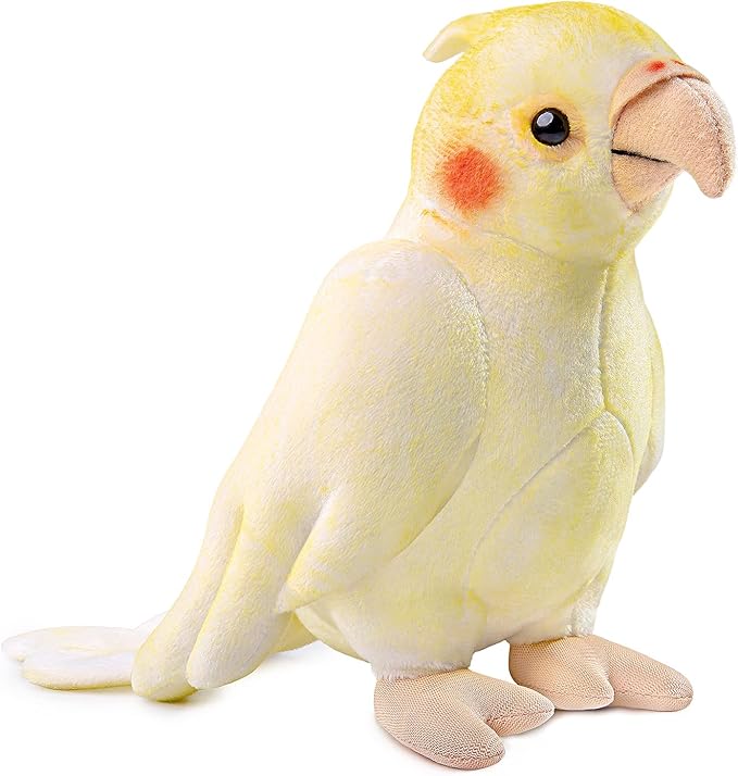 - REALISTIC PARROT PLUSH TOY: This is a lifelike yellow cockatiel toy, imitates real animals. The adorable face and squeezable body of our parrot plush are made from premium cloth and filler. its the yellow fur is smooth and soft, The light yellow head stripe is transparent, the long tail design, the overall shape design is realistic, and the face design is unique, very realistic.