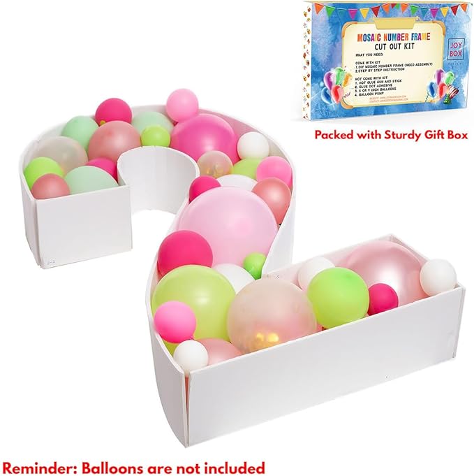 - PRE-CUT KITS FOR INSTANT GLAM: Our mosaic balloon frame is designed for quick and hassle-free assembly. Just grab your glue gun, follow the easy instructions (included), and witness the magic unfold in your celebration with a Joybox Design balloon number frame.